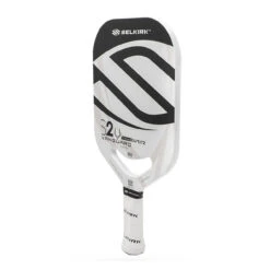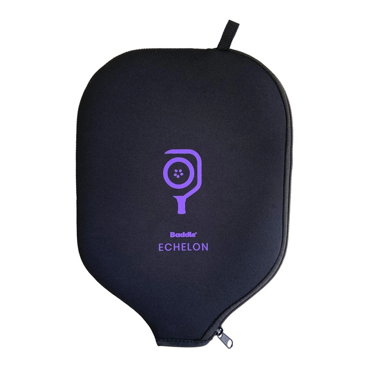 The Echelon Paddle is offered in two small grip circumferences, 3-7/8″ or 4.0″, depending on which best suits your hand size. The weight can also be specified as either a 7.6 oz. (average) midweight, or 8.0 oz. (average) heavyweight model. The overall length is 15.7″, with a blocking-friendly width of 7.8″. The graphite face is augmented with SpinGrit technology which offers the perfect degree of texture and “grabs” pickleballs. A large “B” logo covers one side of the paddle with the model name “Echelon” within it, while the other side is designed with a series of interlocking lines with the Baddle paddle-and-pickle-cross-section logo in the center.