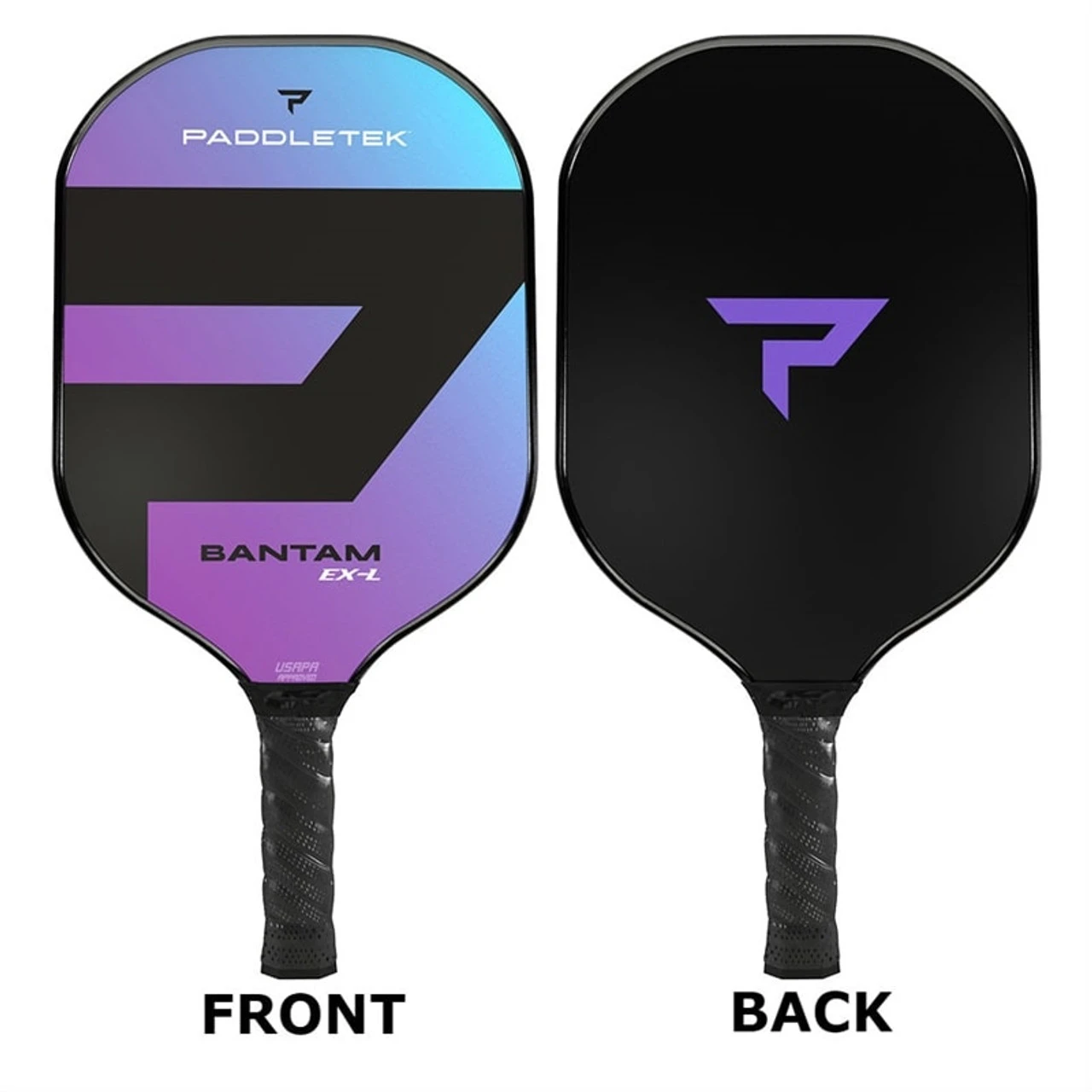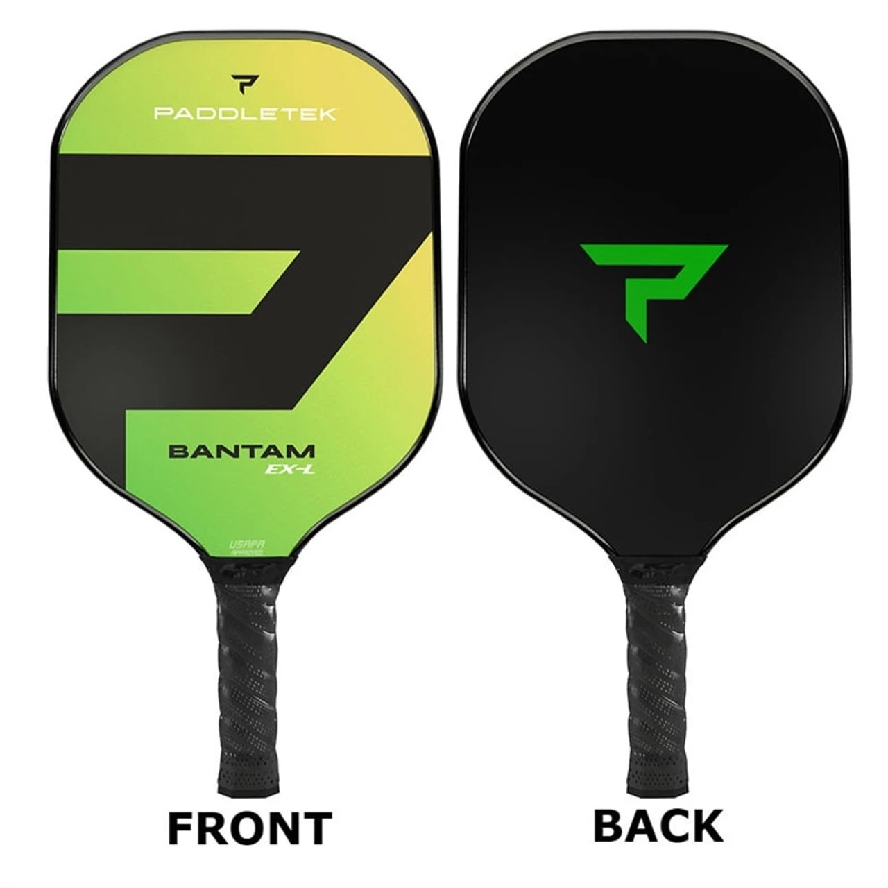 The Bantam EX-L Composite Pickleball Paddle by Paddletek is one of our most popular paddles. This paddle has a specialized, polymer core which was specifically made for pickleball playing. This core was designed to provide greater power, more control and hits that are strong yet quieter than Nomex core paddles. Paddletek created the Bantam to be a winner at a lighter weight. The abstract, geometric vinyl decal is laid on top of the high tech fiberglass face. Inside, the strong polymer core provides a sturdy basis for lots of pickleball play.