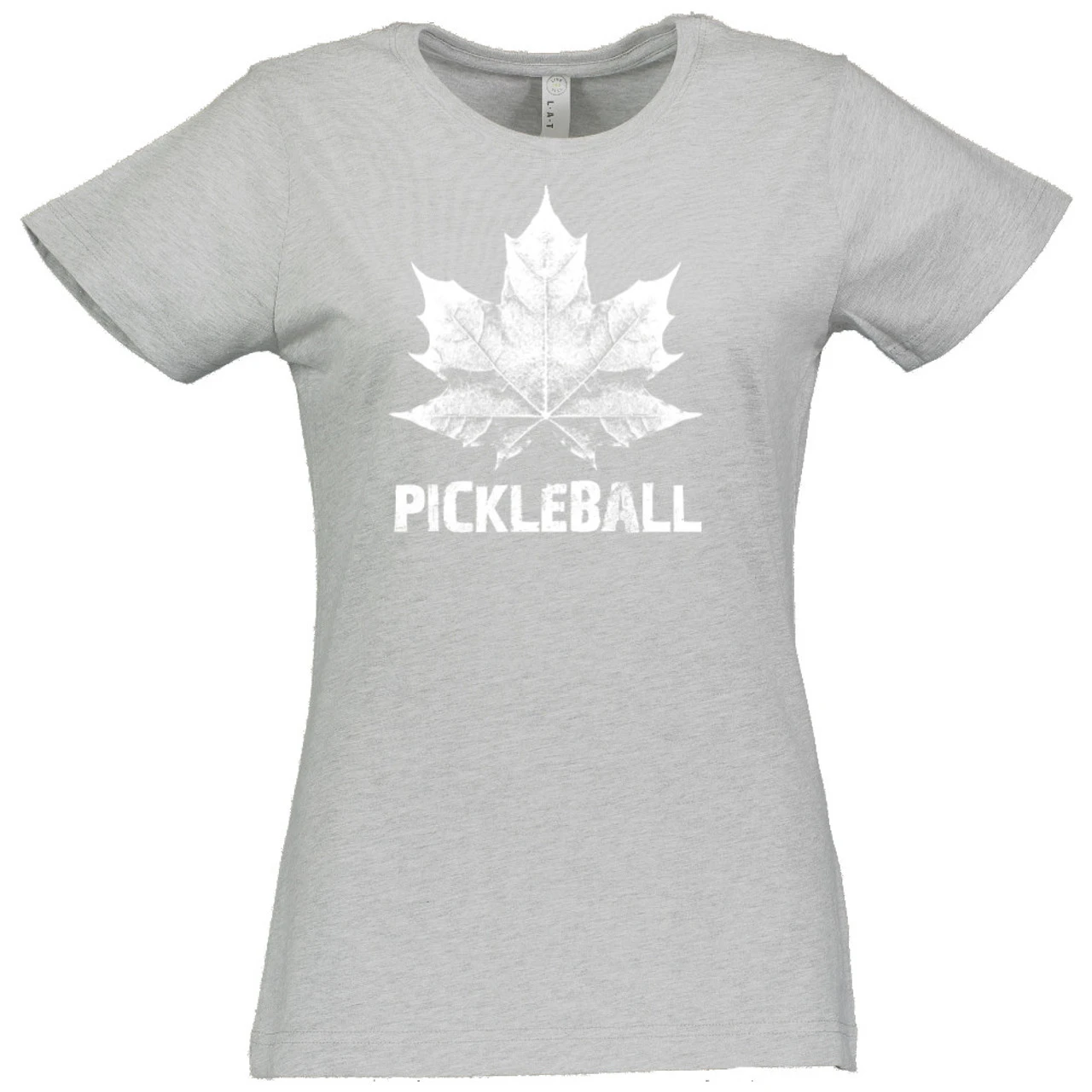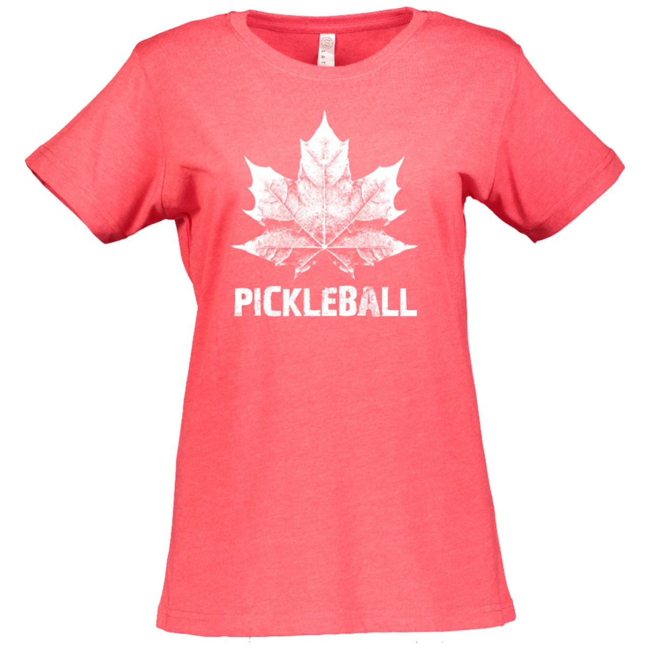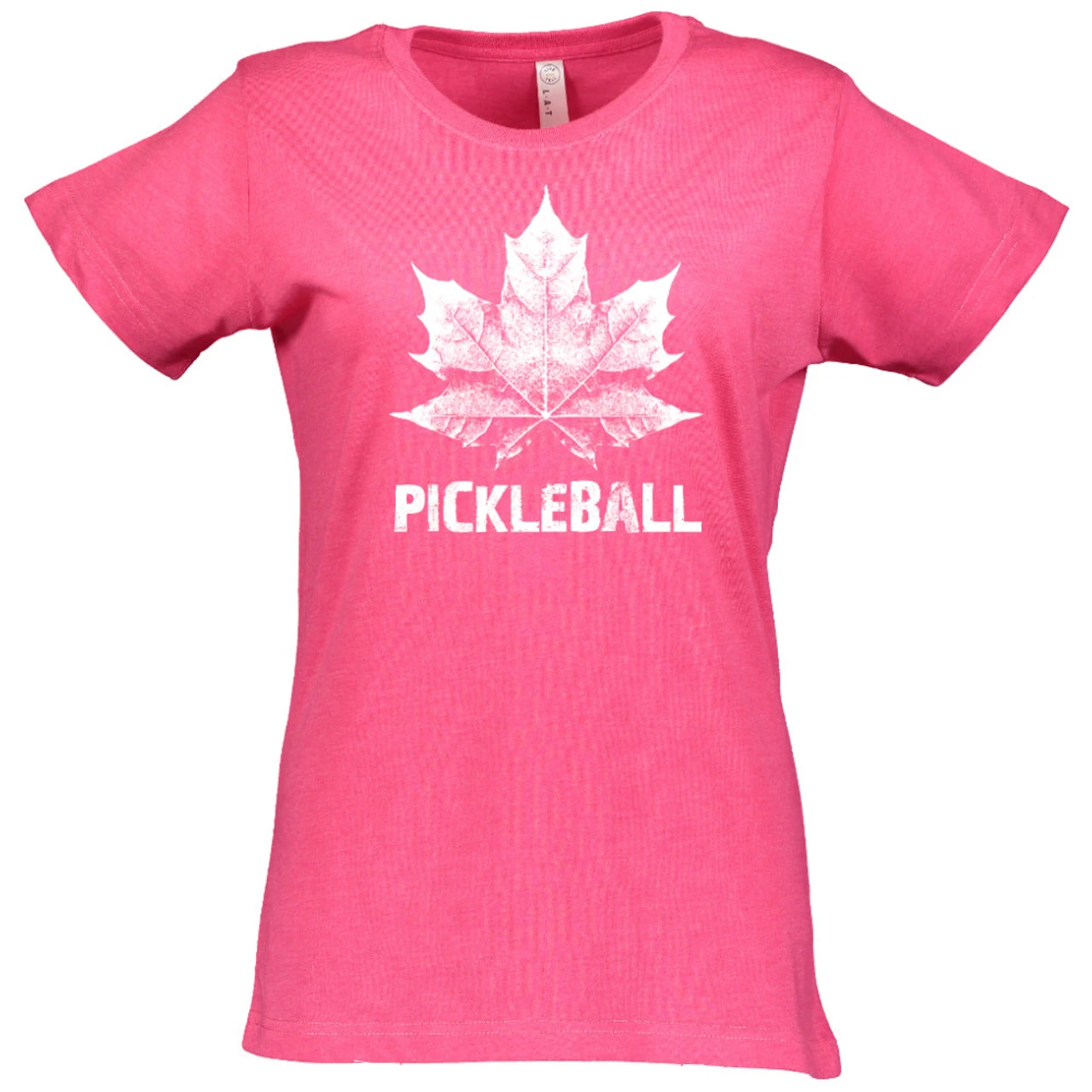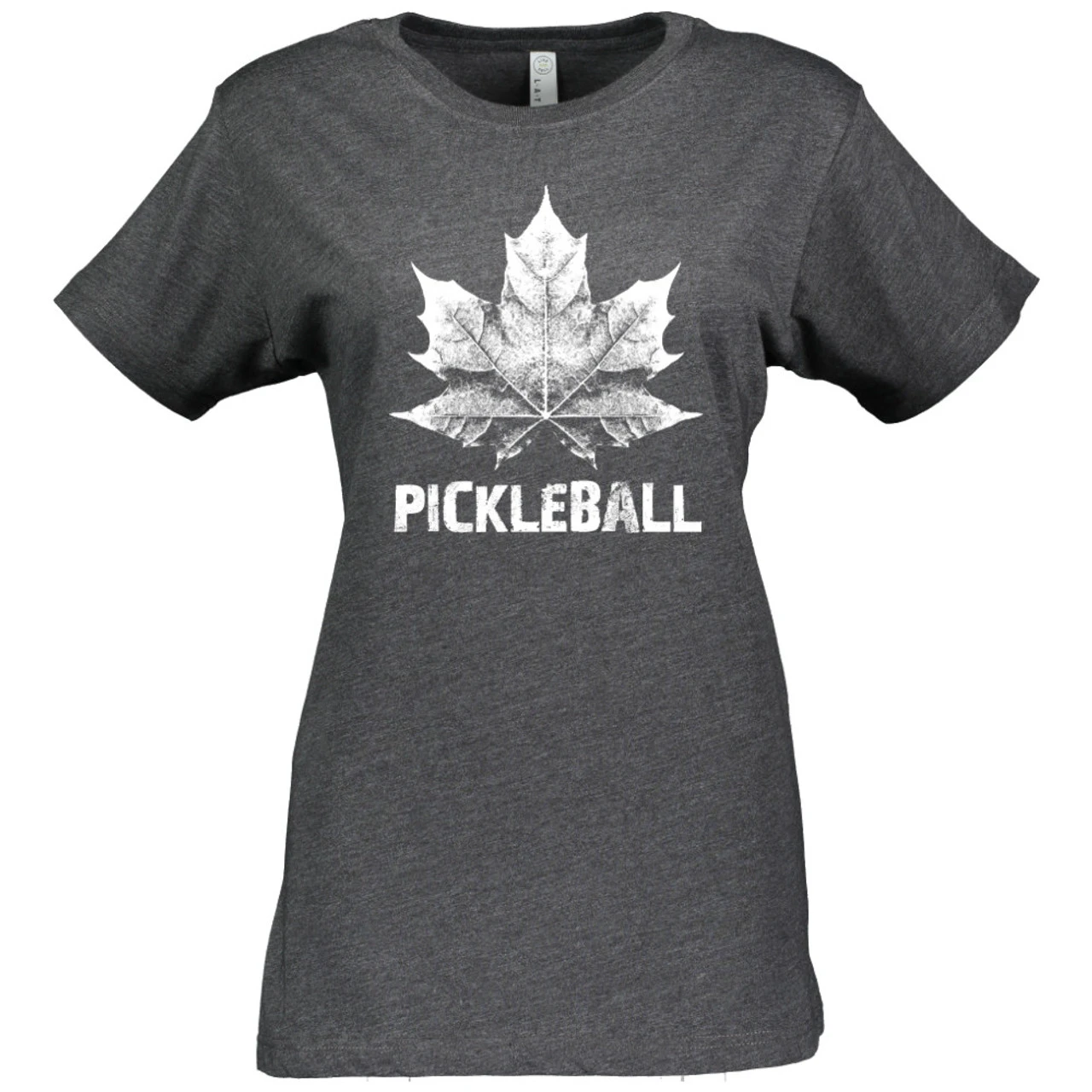 Proud to be a Canadian pickler? Then try this on for size! Features a realistic maple leaf in white with “PICKLEBALL” written below in a lightly distressed font. The design is 8-1/2″ wide and 9-1/2″ tall for a nicely visible design in the front center of the shirt of your choice. The short-sleeve shirt is 4.5oz cotton/poly blend (90/10 in Vintage Heather; 60/40 in all other colors) fine jersey knit with a topstitched ribbed collar. The style is semi-fitted with double-needle sleeves and bottom hem.