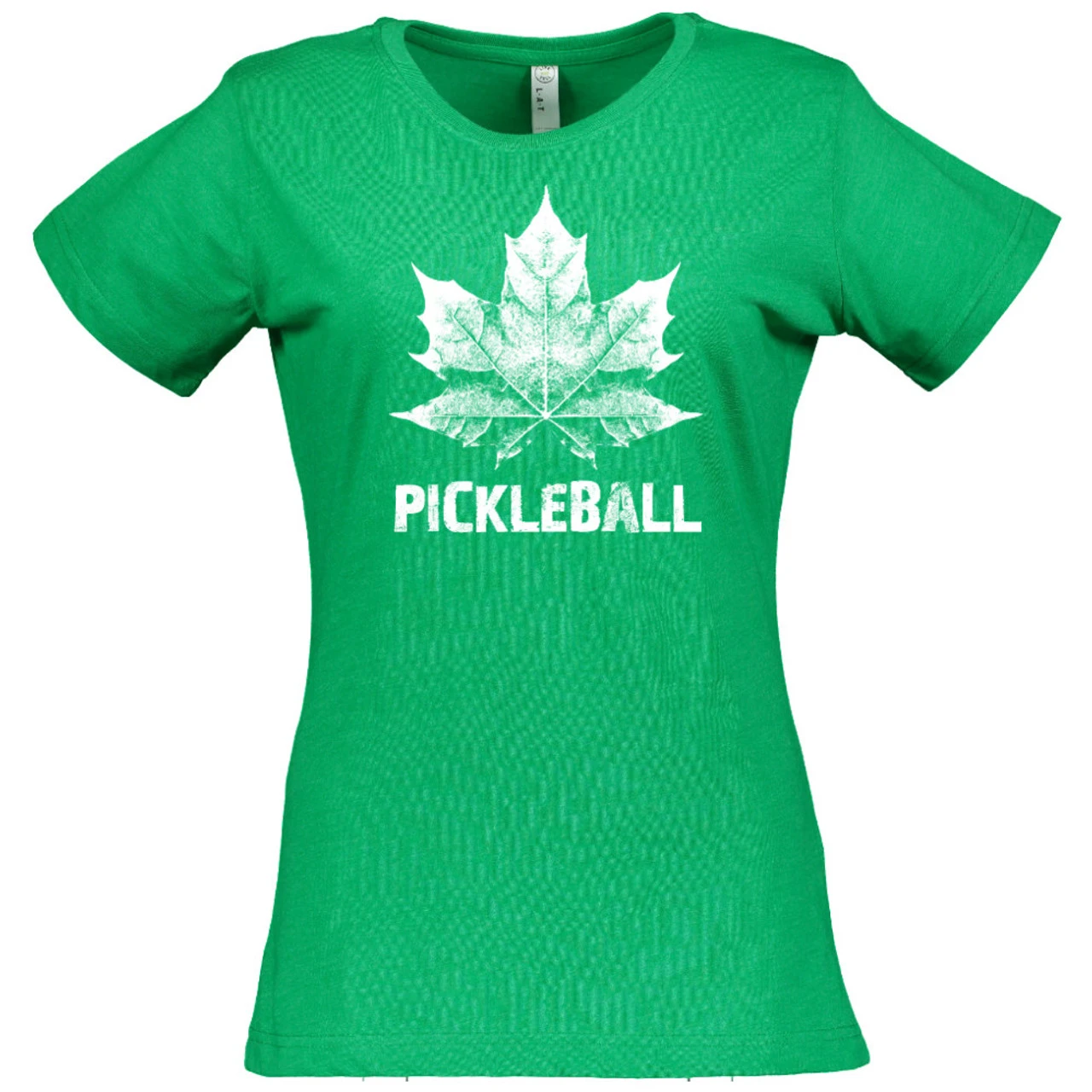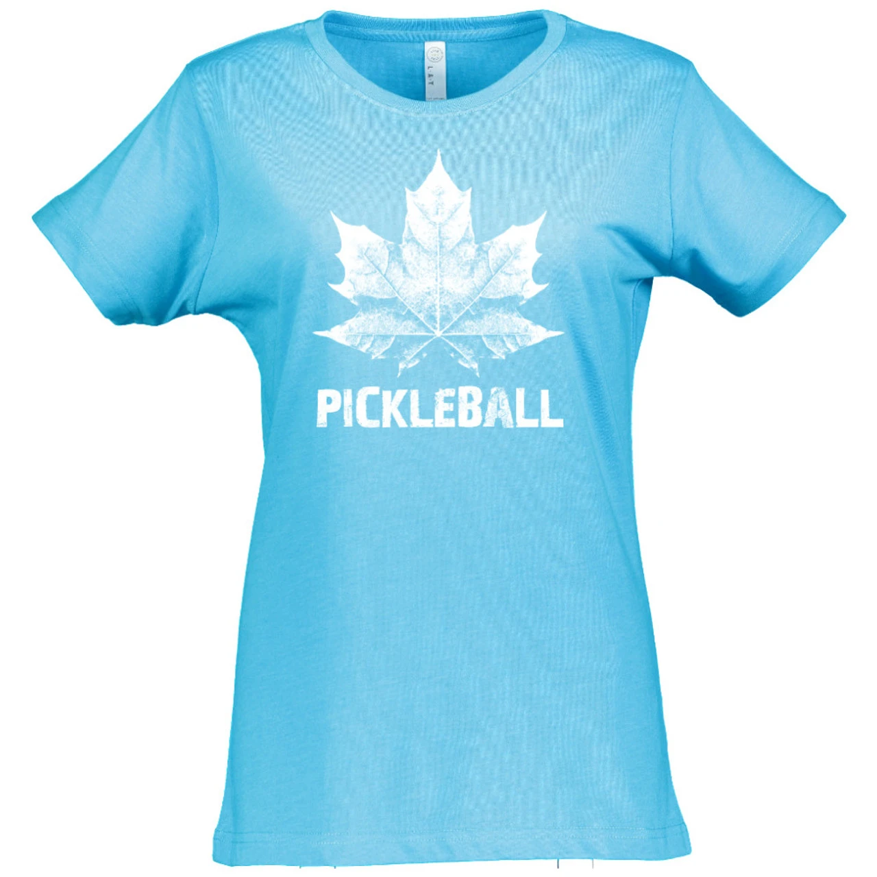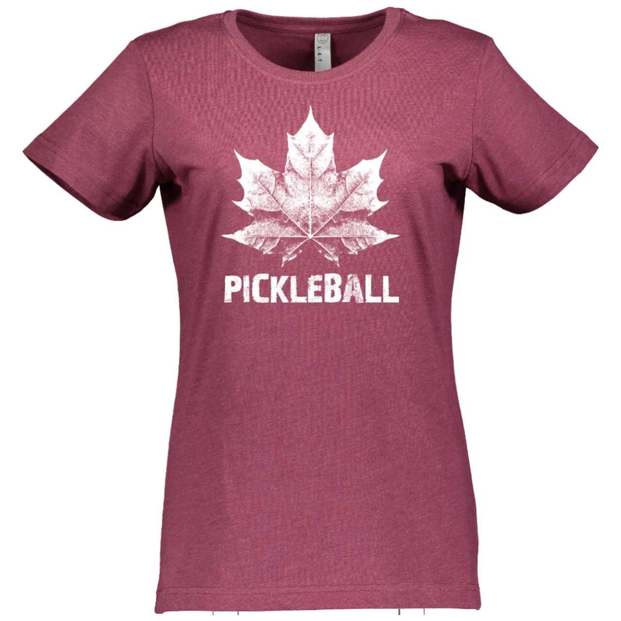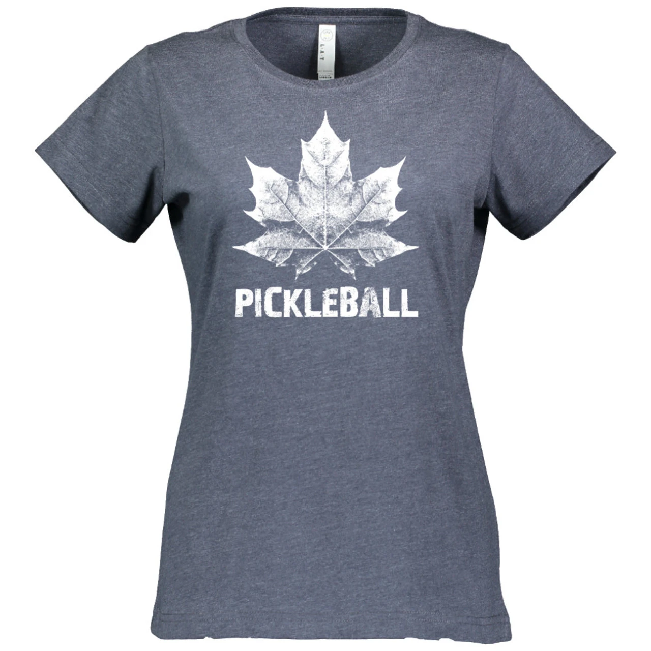 Proud to be a Canadian pickler? Then try this on for size! Features a realistic maple leaf in white with “PICKLEBALL” written below in a lightly distressed font. The design is 8-1/2″ wide and 9-1/2″ tall for a nicely visible design in the front center of the shirt of your choice. The short-sleeve shirt is 4.5oz cotton/poly blend (90/10 in Vintage Heather; 60/40 in all other colors) fine jersey knit with a topstitched ribbed collar. The style is semi-fitted with double-needle sleeves and bottom hem.