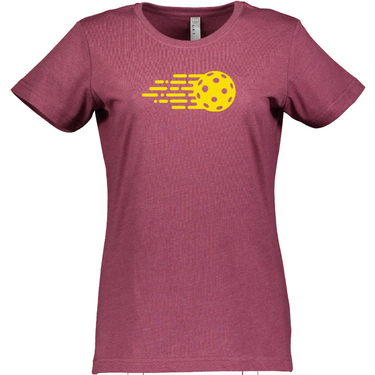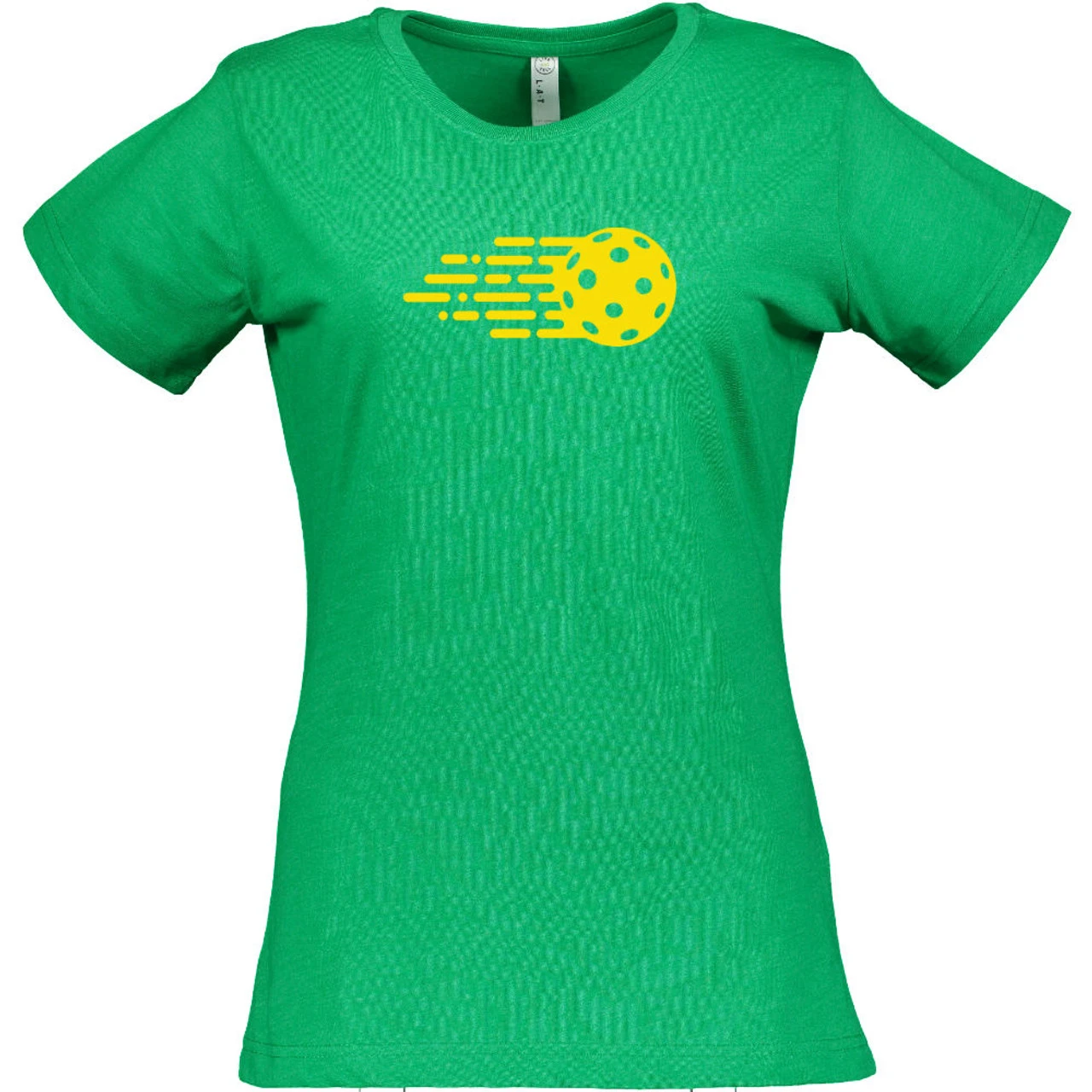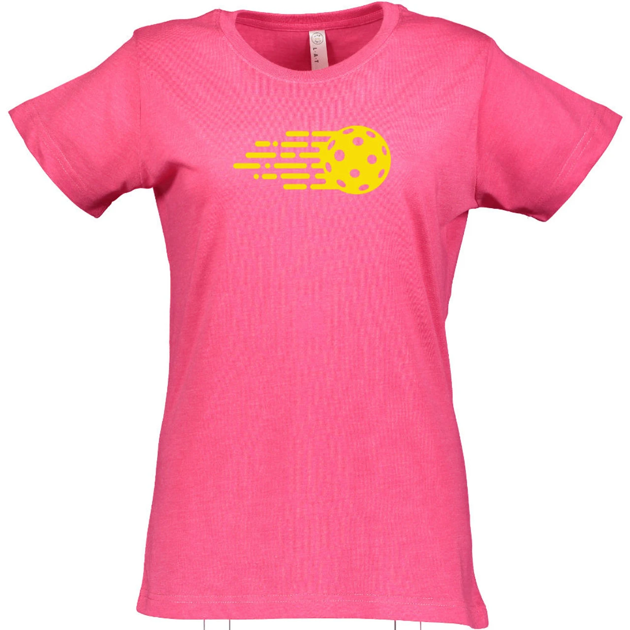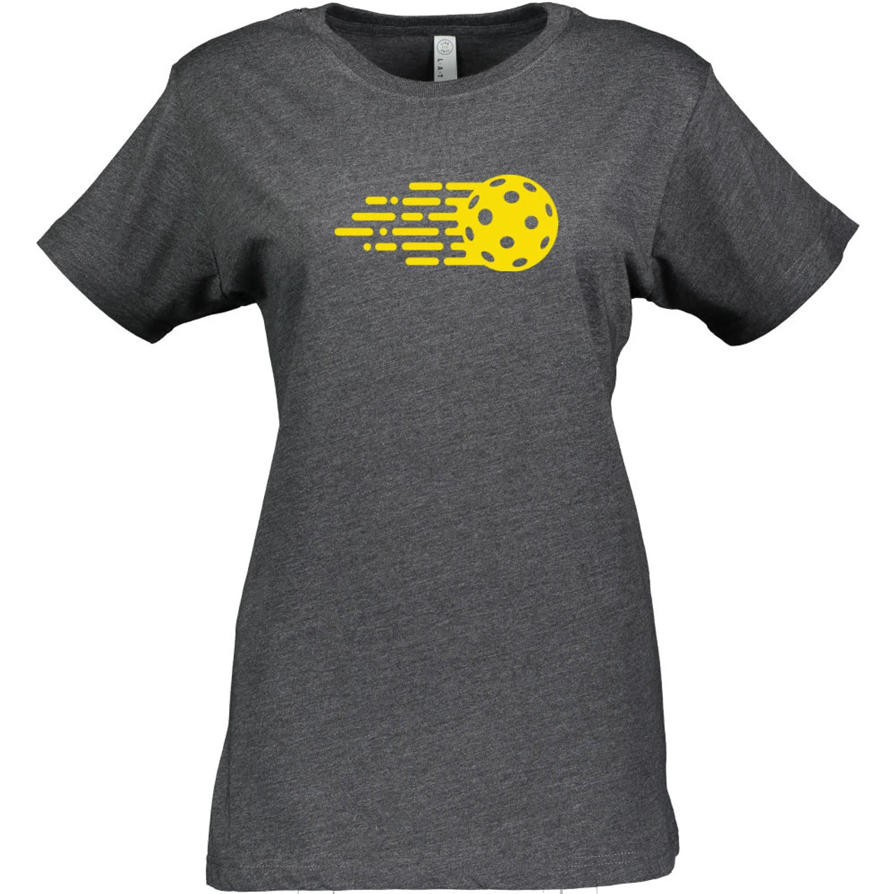 If you’re known to send pickleballs flying fast and true with your hits, this shirt is a perfect nod to your talents. The image shows a speeding pickleball hurling across the center of your shirt. Design measures 5″w by 2-1/4″h. The short-sleeve shirt is 4.5oz cotton/poly blend (90/10 in Vintage Heather; 60/40 in all other colors) fine jersey knit with a topstitched ribbed collar. The style is semi-fitted with double-needle sleeves and bottom hem.