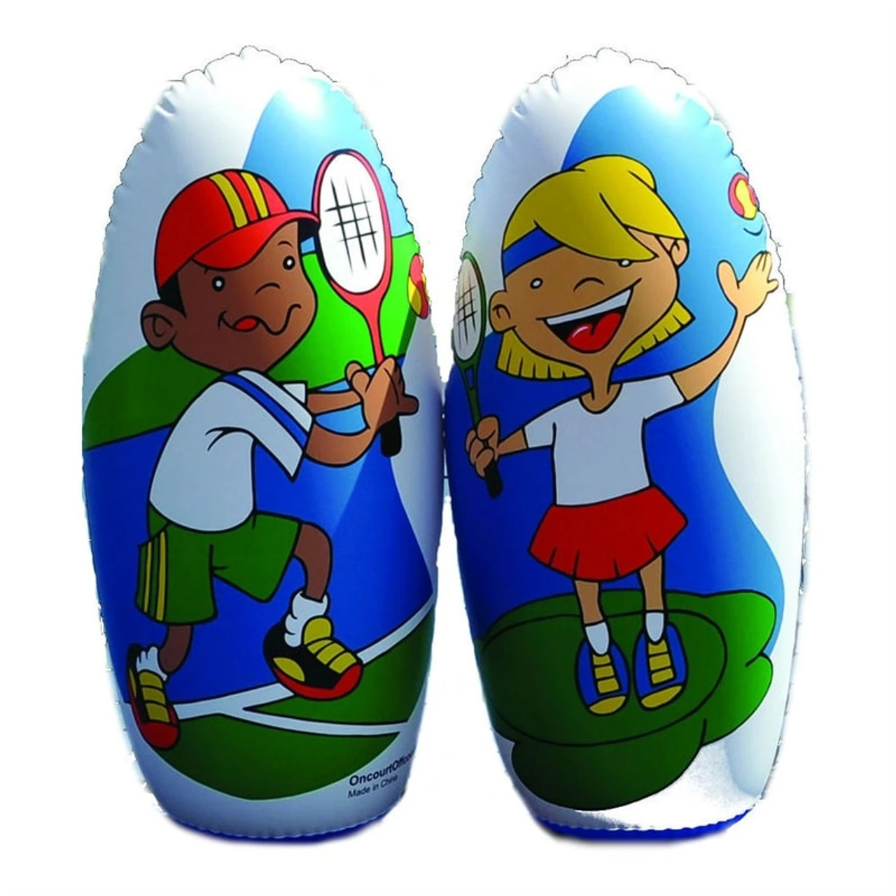 The Mini-Target Knockdowns come in a set of two and stand 36″ tall. One target features a boy wielding his racquet, while the other has a girl tossing a ball into the air as she prepares her serve. Technically, they’re holding tennis racquets and not paddles, but we think they work for pickleball just as well! The base should be filled with water before filling the top with air, as this serves to keep the inflatables standing tall after being hit. Be careful not to store near sharp objects or over-inflate the top.