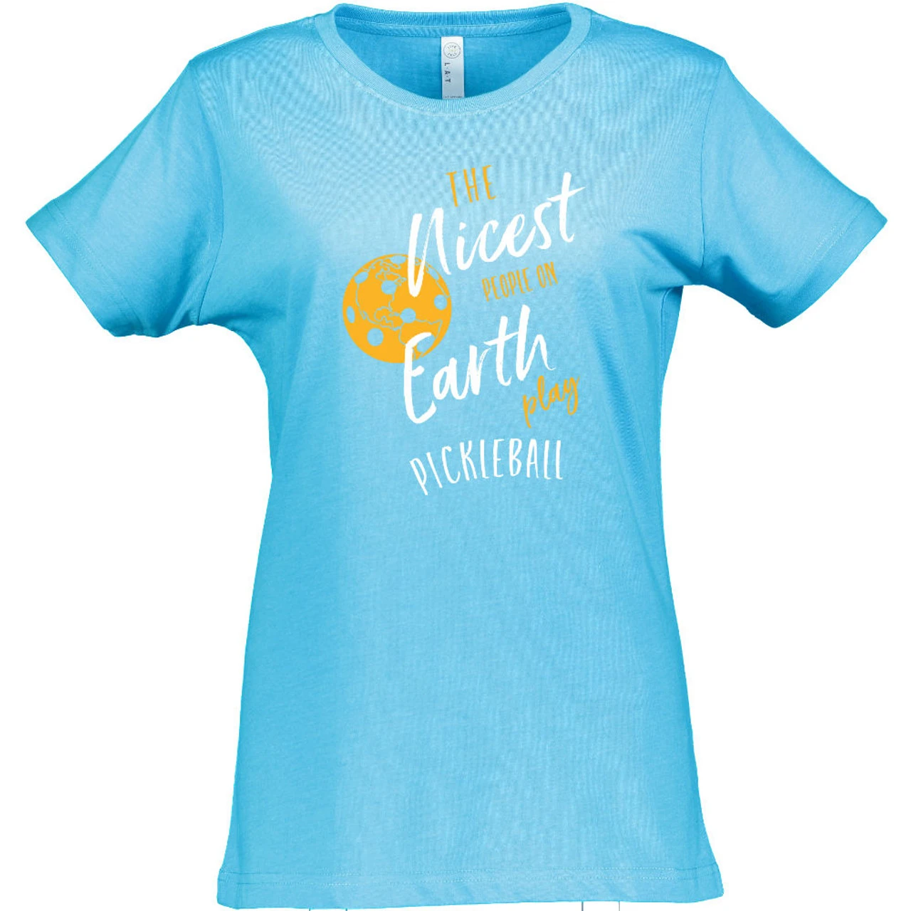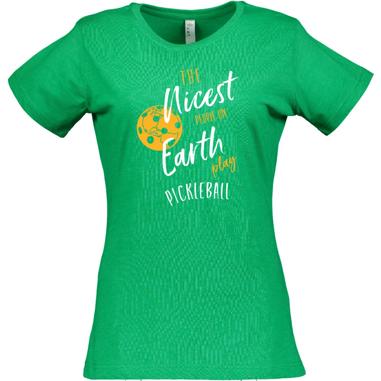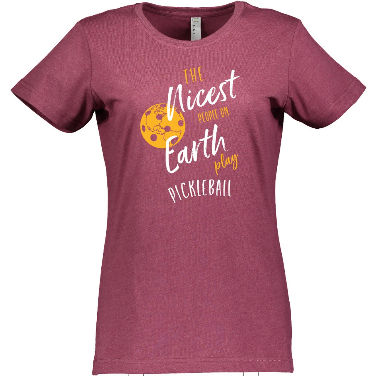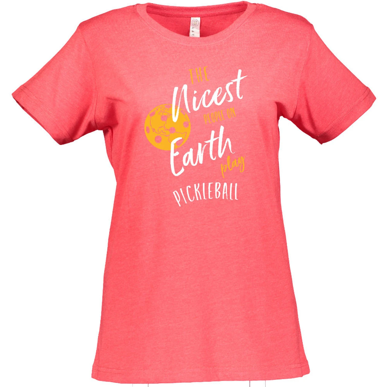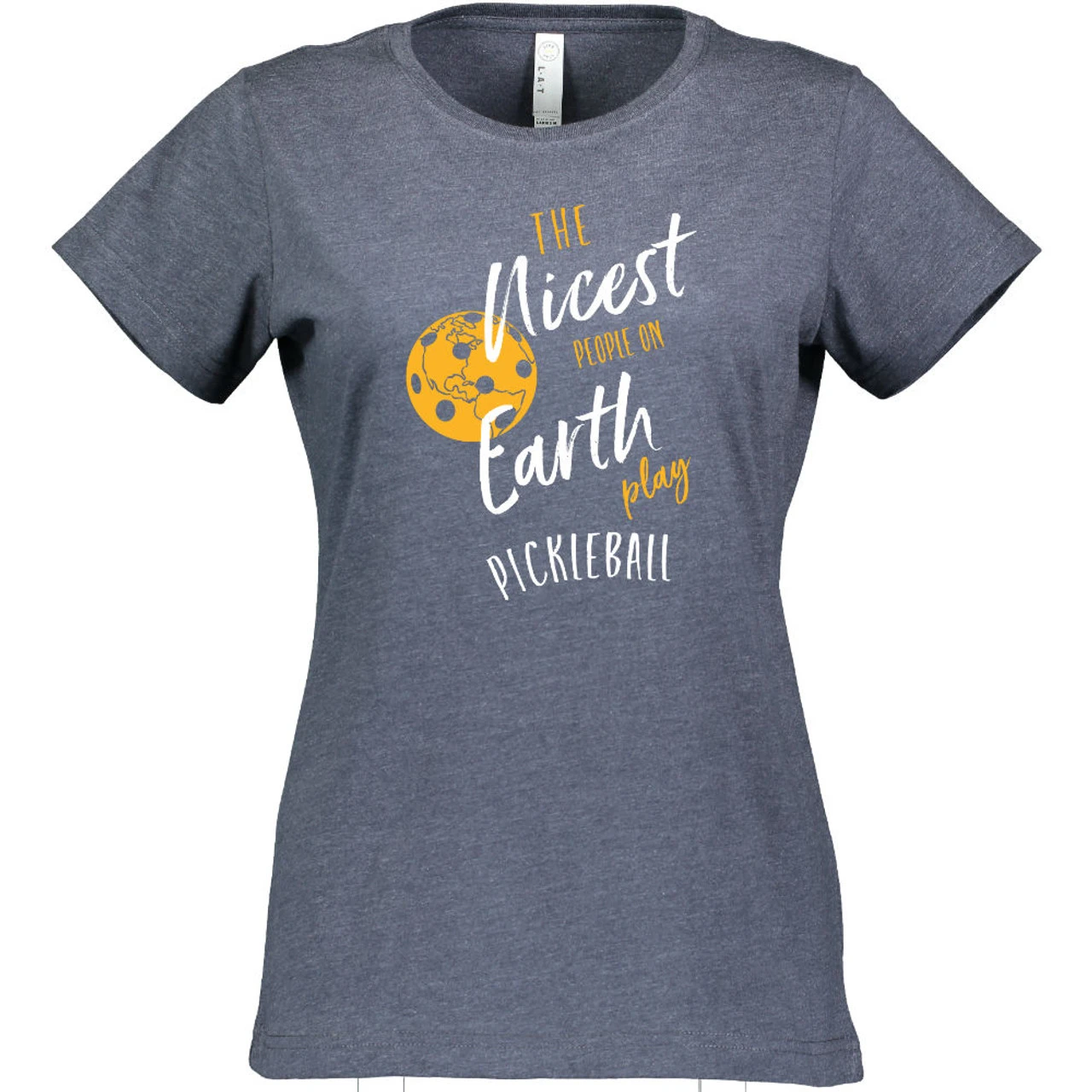The Women’s Nicest People Shirt is for those who appreciate the wonderful people in the pickleball community. It reads, “The nicest people on earth play pickleball” and shows an earth-like pickleball to the left dotted with the planet’s continents. It is 6.8 x 9.2″ and centered in the middle of the shirt. The short-sleeve shirt is 4.5oz cotton/poly blend (90/10 in Vintage Heather; 60/40 in all other colors) fine jersey knit with a topstitched ribbed collar. The style is semi-fitted with double-needle sleeves and bottom hem.