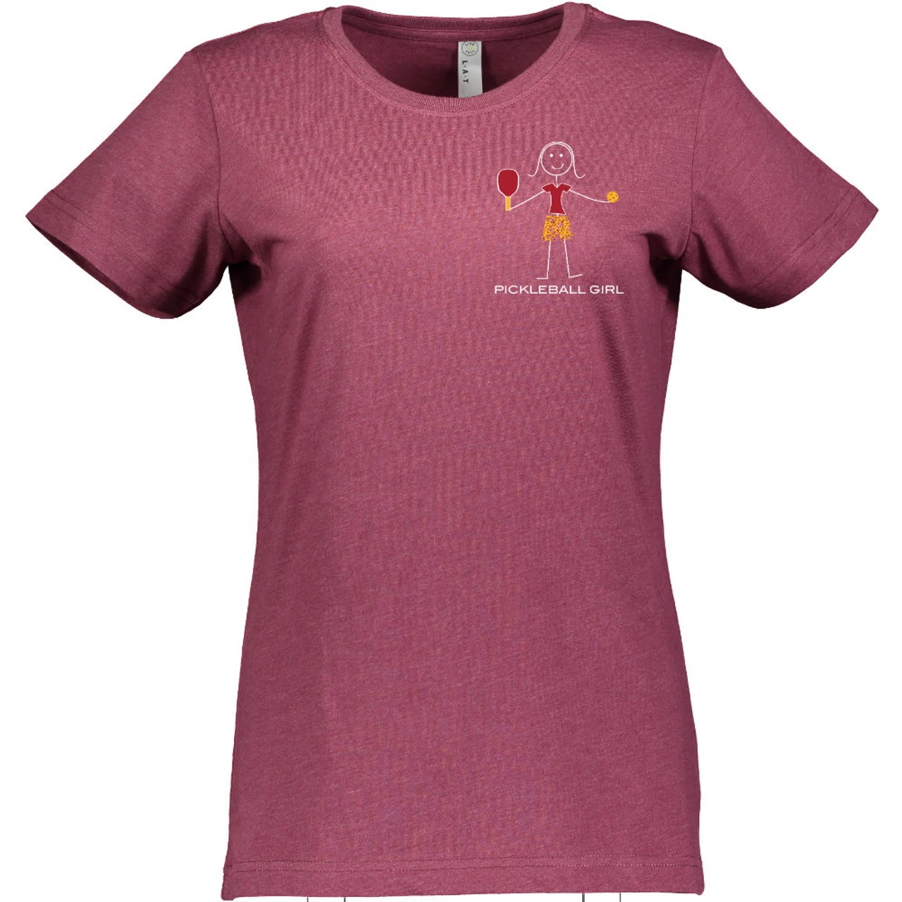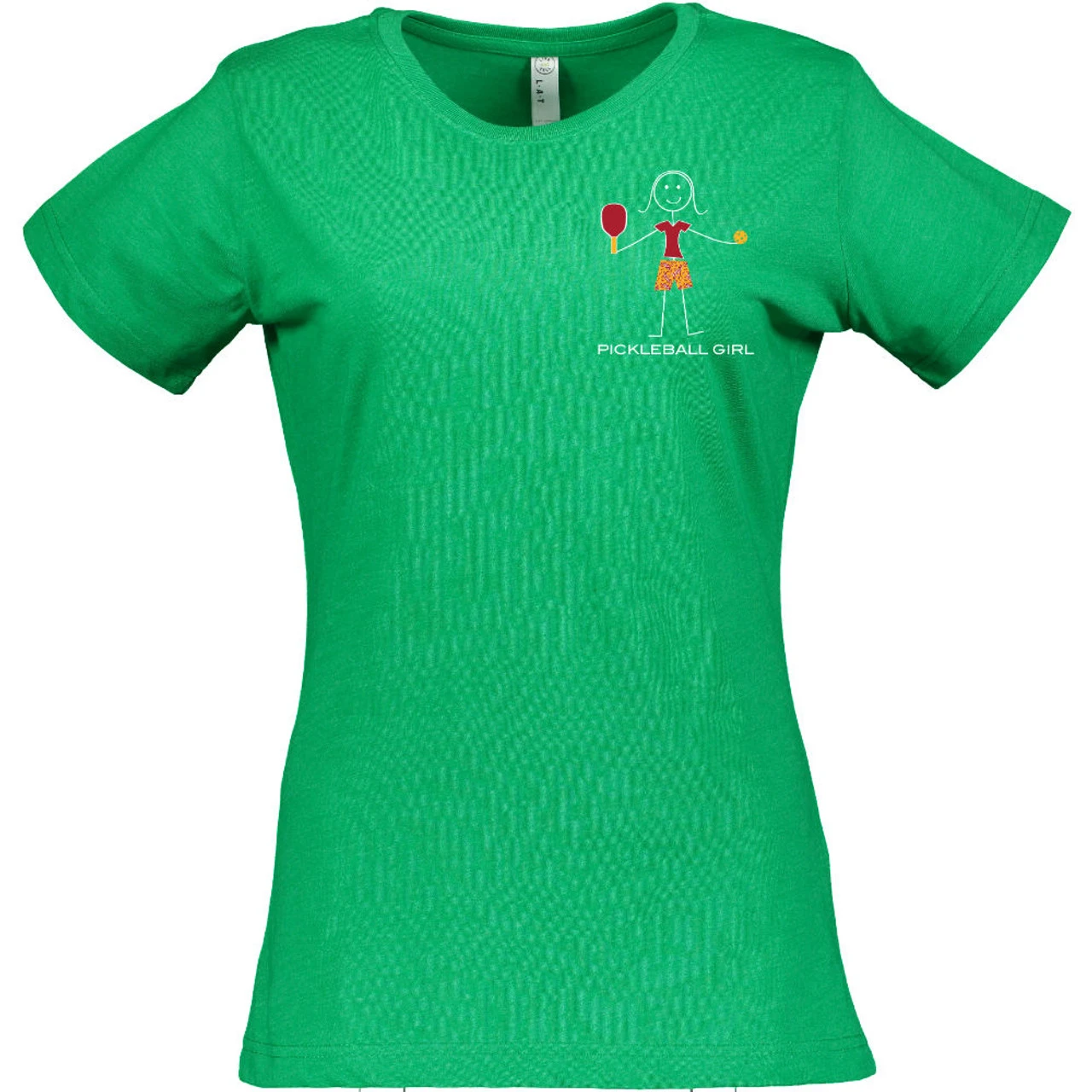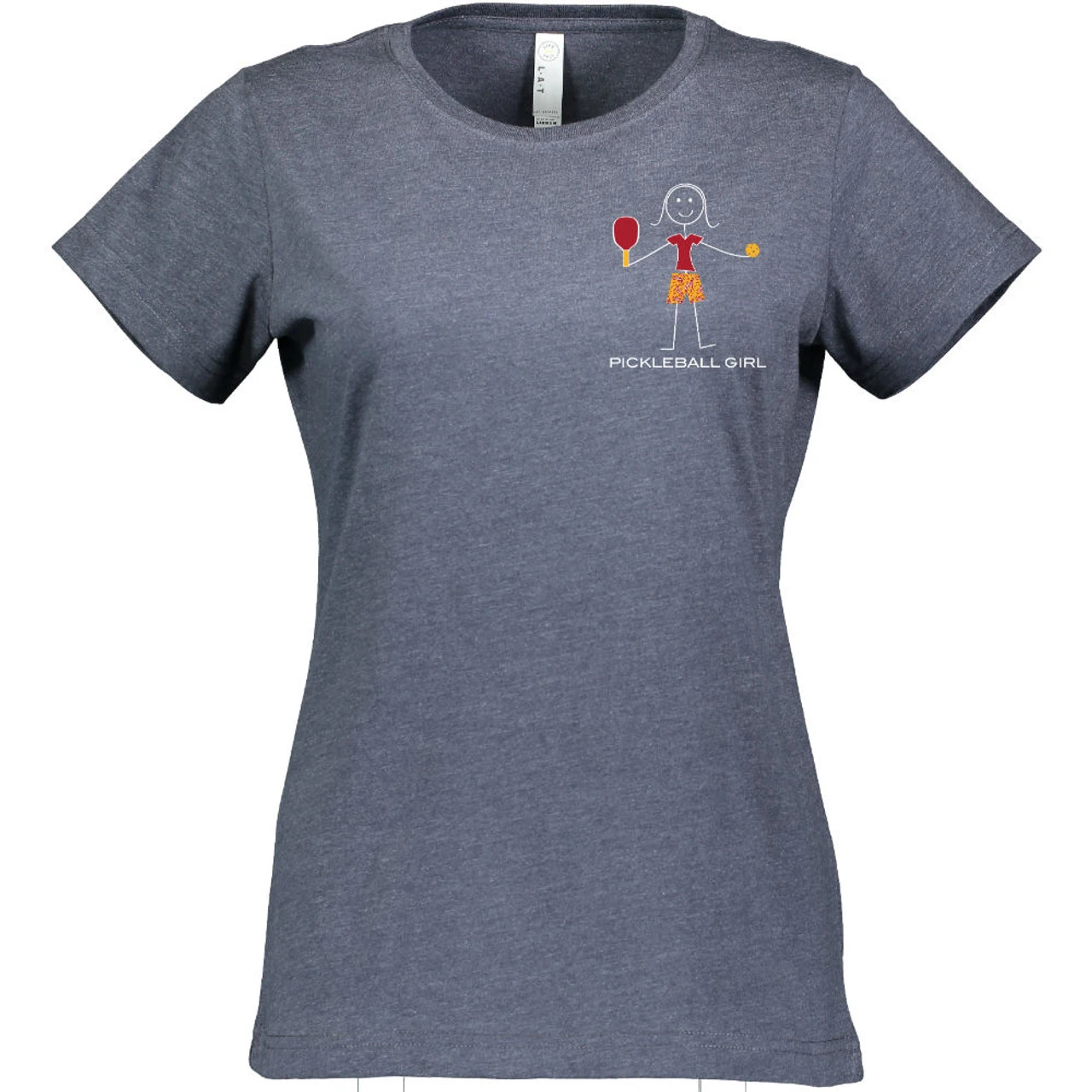 The Women’s Pickleball Girl Pro Shirt clearly states your dedication to the game with the words “Pickleball Girl” written below a cute stick figure. The player wears bright shorts and a top while gripping her pickleball and paddle. The image is located on the left side of the chest and measures 3-1/4″ wide by 3-3/4″ tall, printed with red, gold and white colors. The short-sleeve shirt is 4.5oz cotton/poly blend (90/10 in Vintage Heather; 60/40 in all other colors) fine jersey knit with a topstitched ribbed collar. The style is semi-fitted with double-needle sleeves and bottom hem.