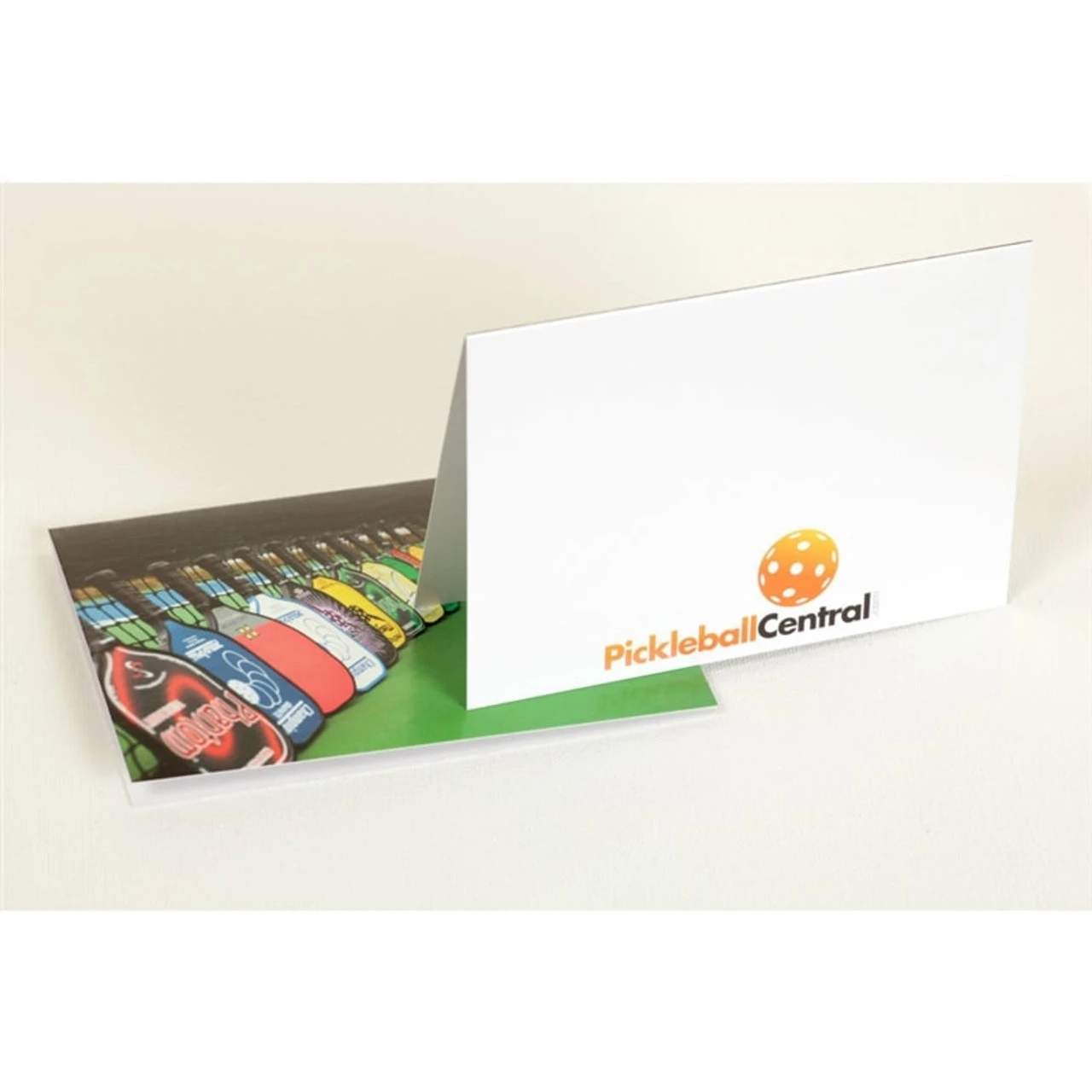 The Pickleball Note Cards come packaged in a set of 10, complete with white envelopes. Each card measures 5” wide and 3-1/2” high. Centered on the lower back of each card is the PickleballCentral logo in orange and black text, as well as an orange pickleball right above the words.