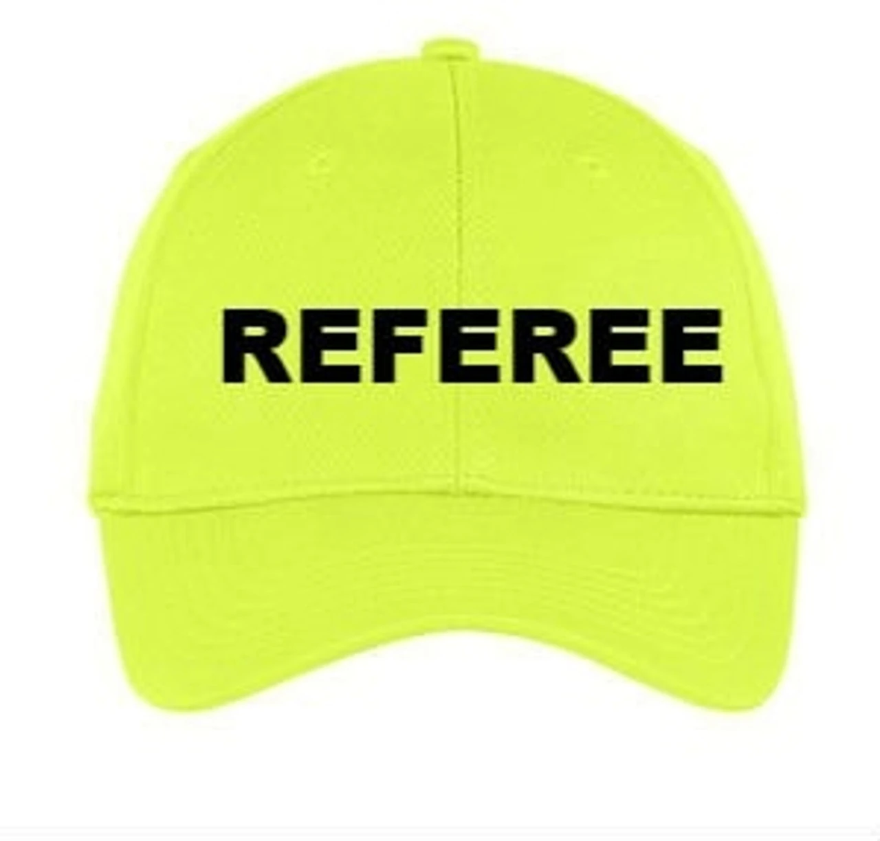 The Pickleball Tournament Referee Hat comes in neon yellow fabric with bold black lettering that reads “REFEREE.” There is only one size, but the fabric has some stretch to it and comes with an adjustable velcro closure in the back to accommodate all players.