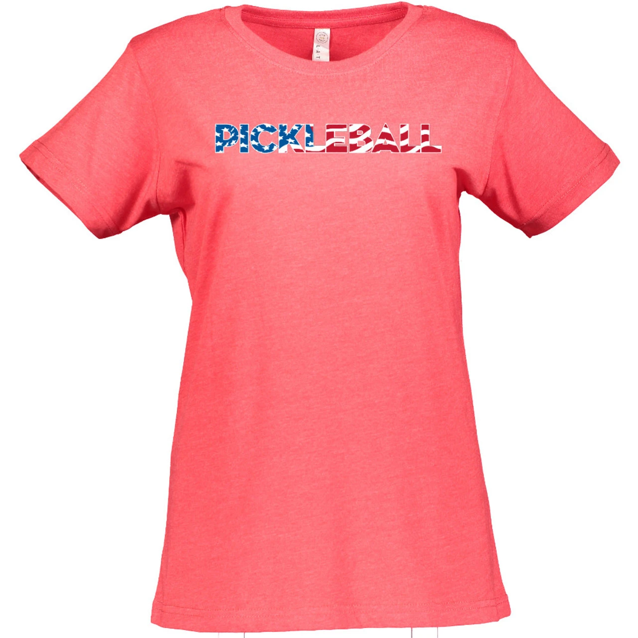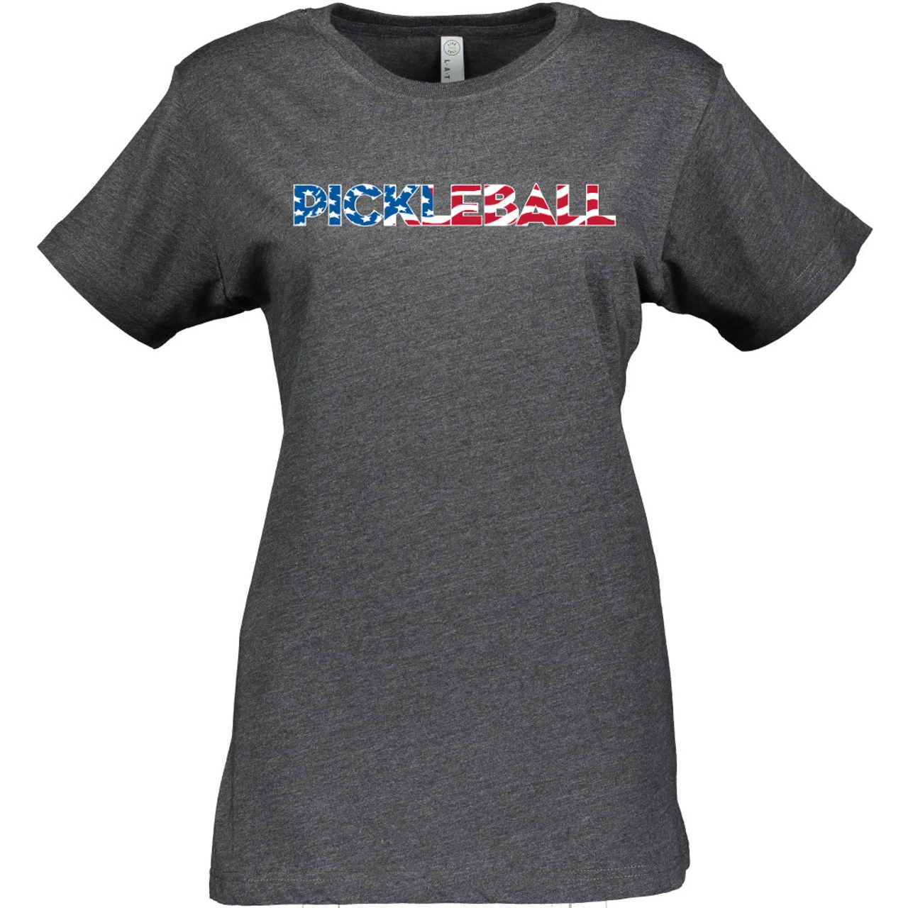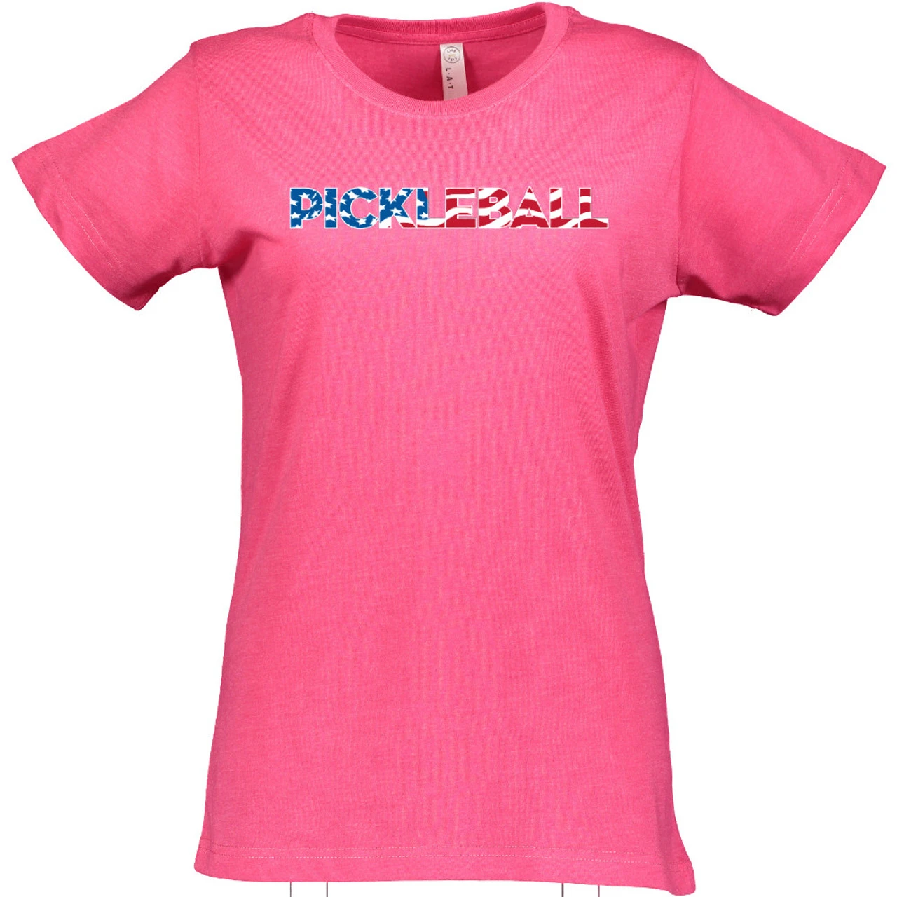 Playing on the 4th of July, entering a country-based tournament or just enjoy some patriotic flavor? This image features the American flag’s design within the word “PICKLEBALL” so you can add more flare to any game. Sits over the center front of the shirt of your choice. The short-sleeve shirt is 4.5oz cotton/poly blend (90/10 in Vintage Heather; 60/40 in all other colors) fine jersey knit with a topstitched ribbed collar. The style is semi-fitted with double-needle sleeves and bottom hem.
