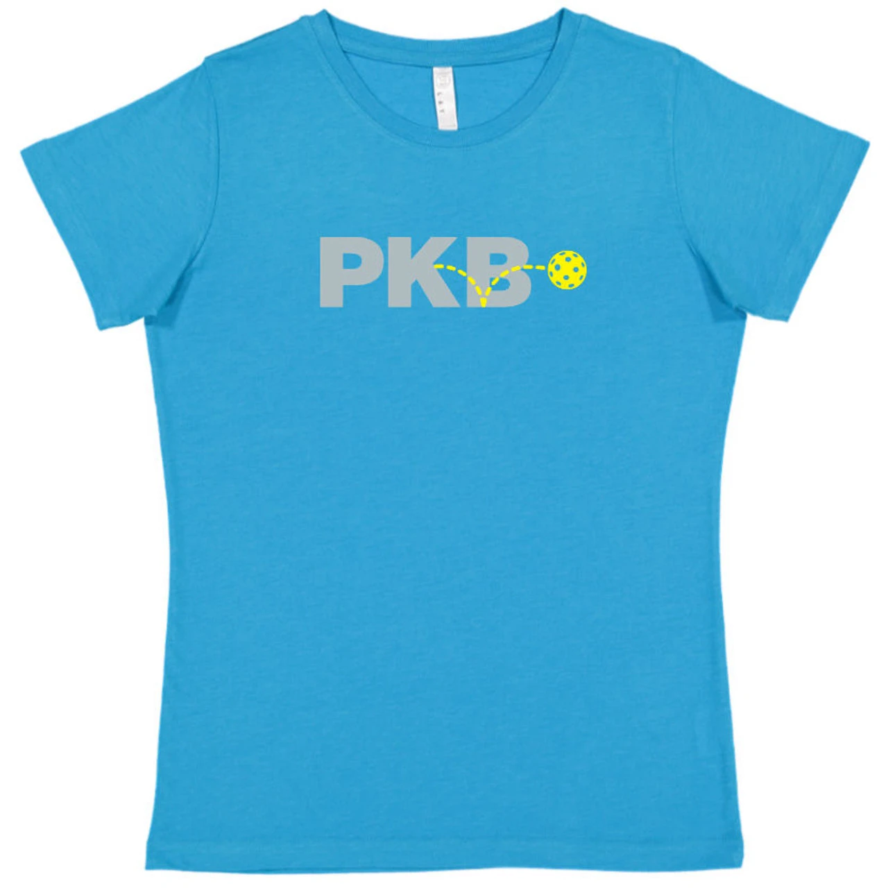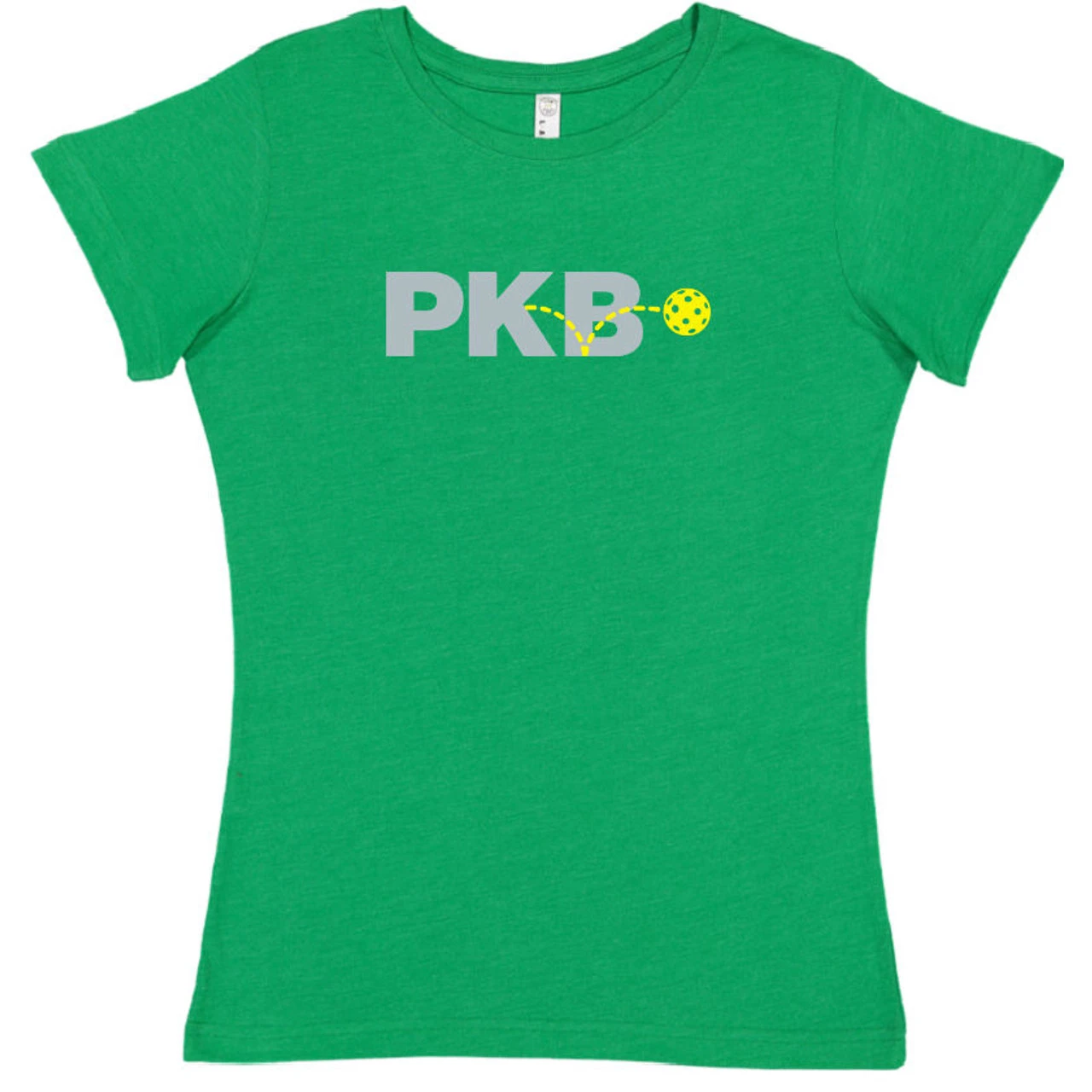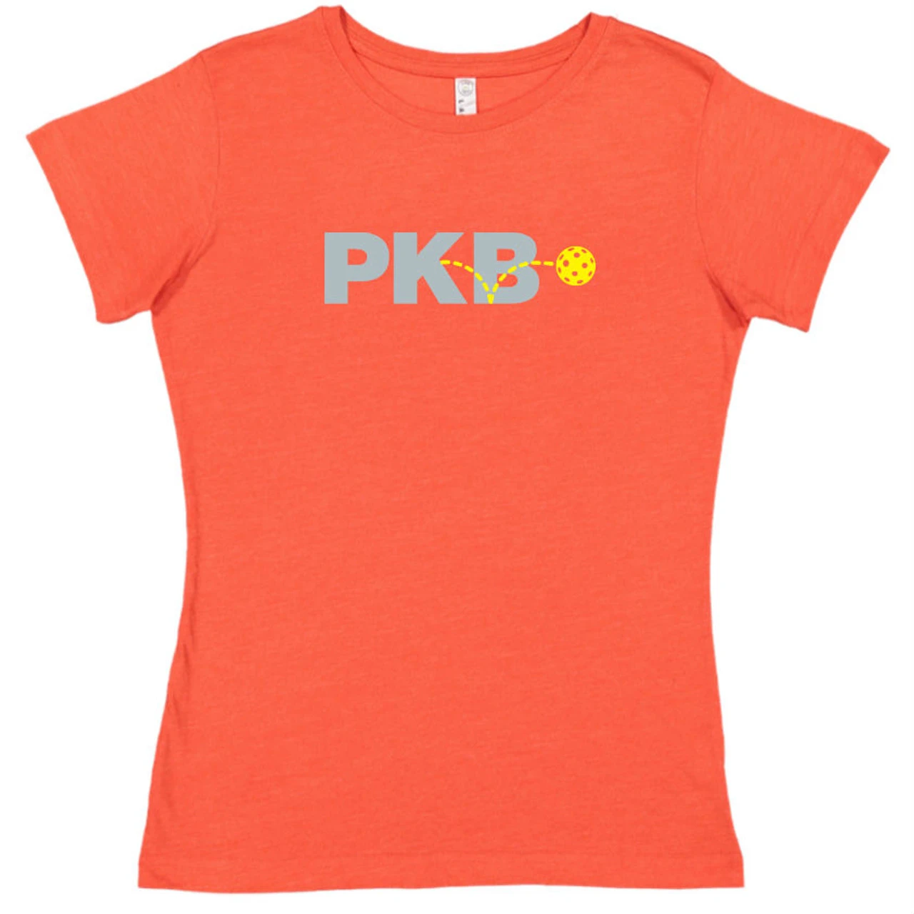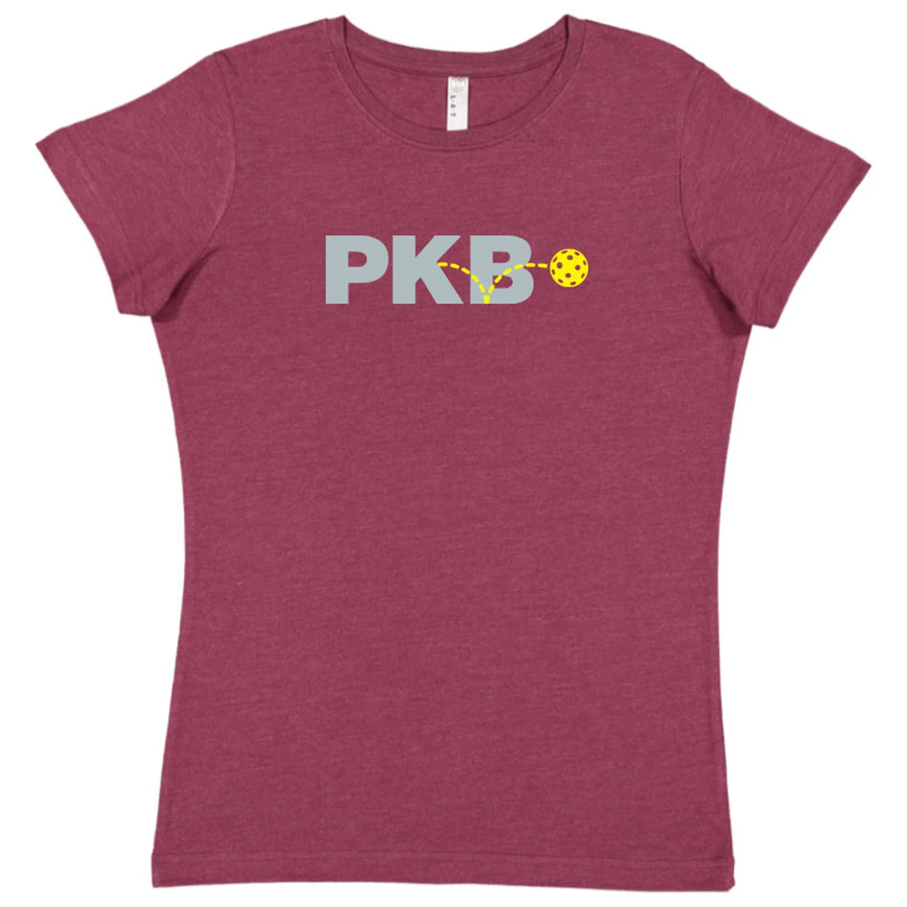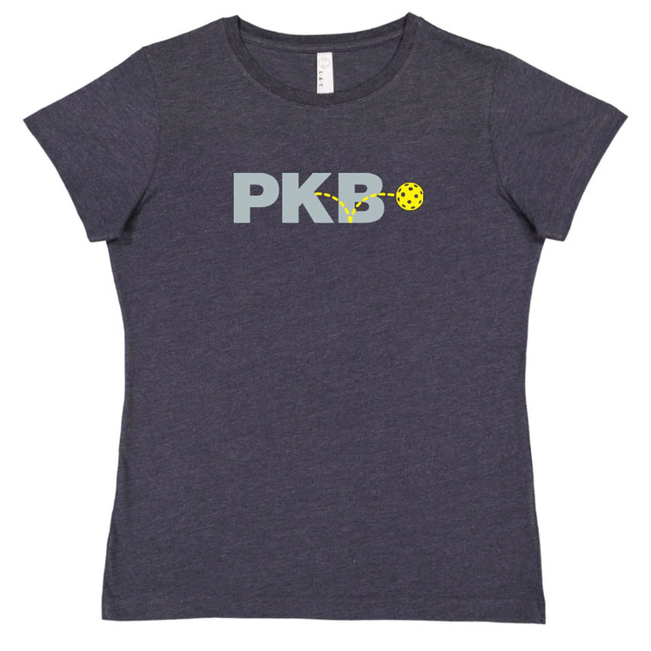 Keep it short and sweet with this image abbreviating pickleball with the letters “PKB” and a ball bouncing toward the right of the design. Shown centrally on the shirt, it measures 5-3/4″w by 1-1/2″h and is displayed in yellow and gray ink. The short-sleeve shirt is 4.5oz cotton/poly blend (90/10 in Vintage Heather; 60/40 in all other colors) fine jersey knit with a topstitched ribbed collar. The style is semi-fitted with double-needle sleeves and bottom hem.