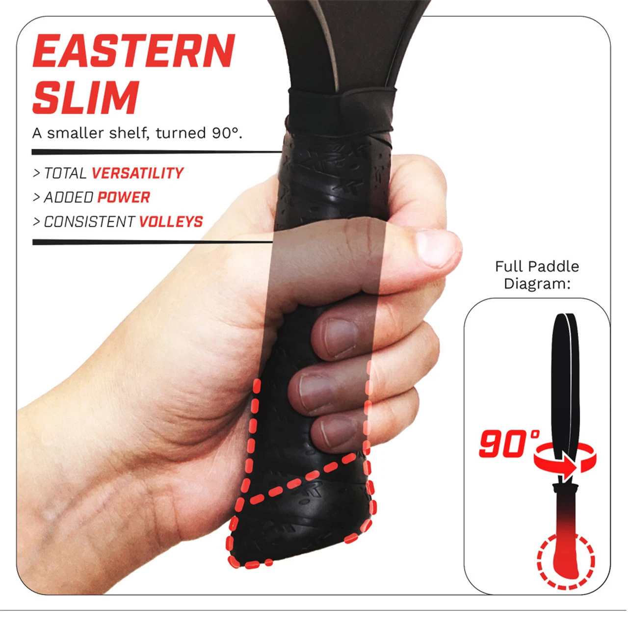 The Raw Carbon Fiber 14 Pickleball Paddle offers a 16.5″ overall length and 7.5″ wide face on the end of their XR-23 handle, which arrives wrapped in a performance-tac cushion grip. The XR-23 handle offers an ergonomic 23-degree slant that helps you reload quickly and add more spin to all of your shots. This grip is available with a small butt cap for eastern grips and a large butt cap for continental grips.